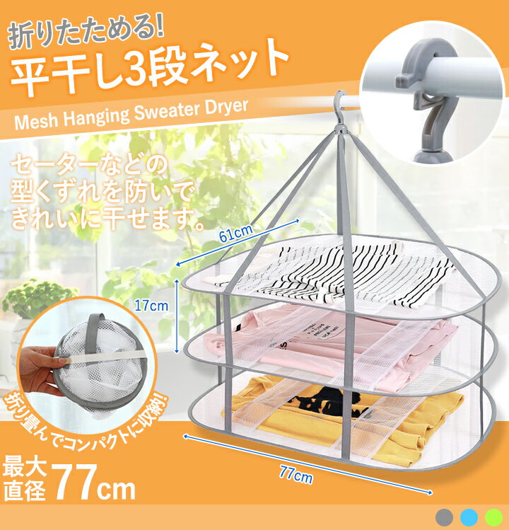 ■商品名 ■重量 平干し3段ネット約400g ■サイズ ■素材 約61cm x 横77cm x 高さ78cm グレー、ブルーグリーン ■注意事項 ●商品写真はできる限り実物の色に近づけておりますが、お客様が使用するパソコンのモニター環境により色の変化が感じられる場合がございます。