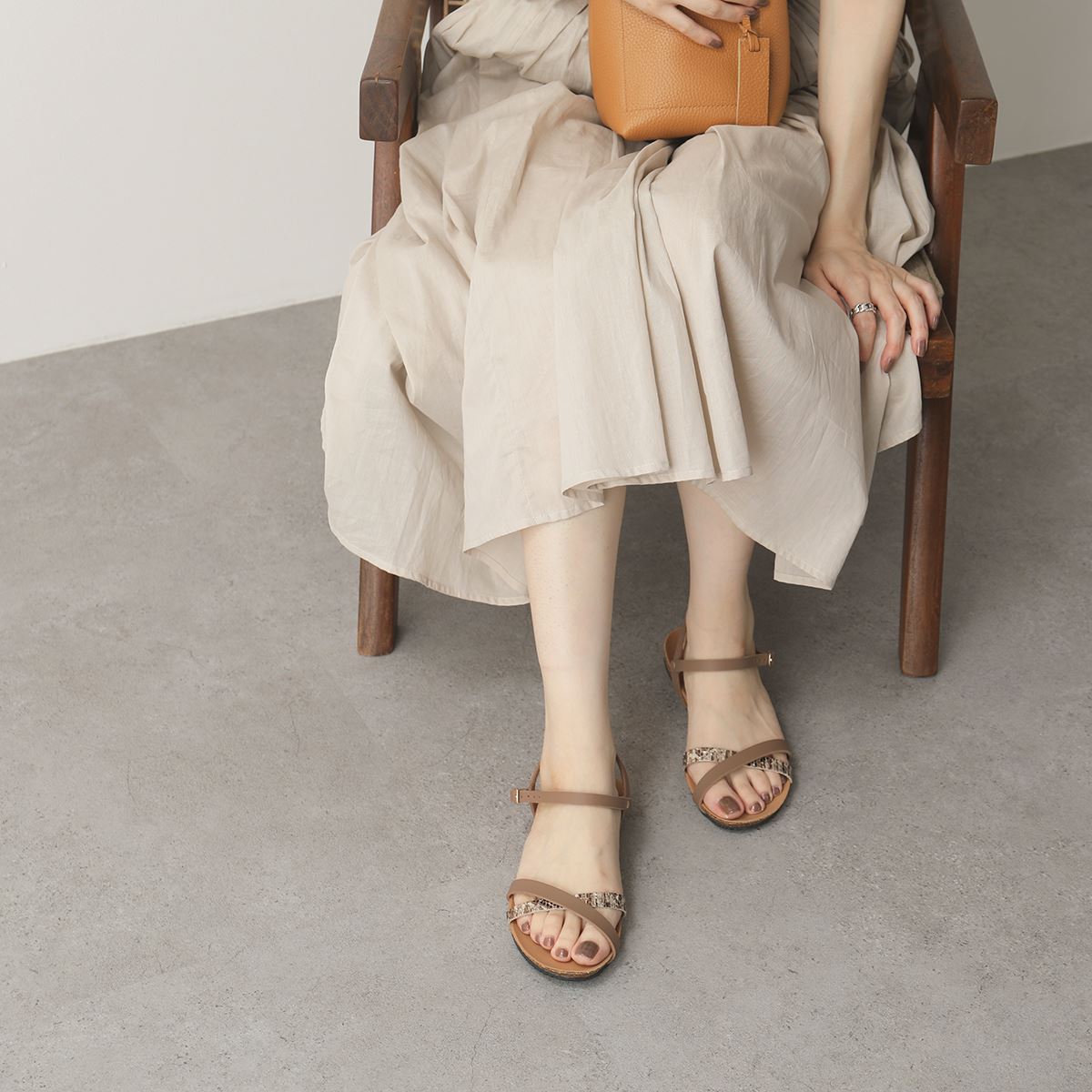 素材 アッパー:合皮 ソール:コルク、ラバー 柔軟性と弾力性に優れており、 耐久性もありながら水に強い特性もあるのでアウトドアなどにも最適なストラップサンダル。