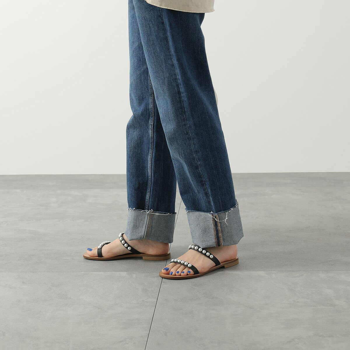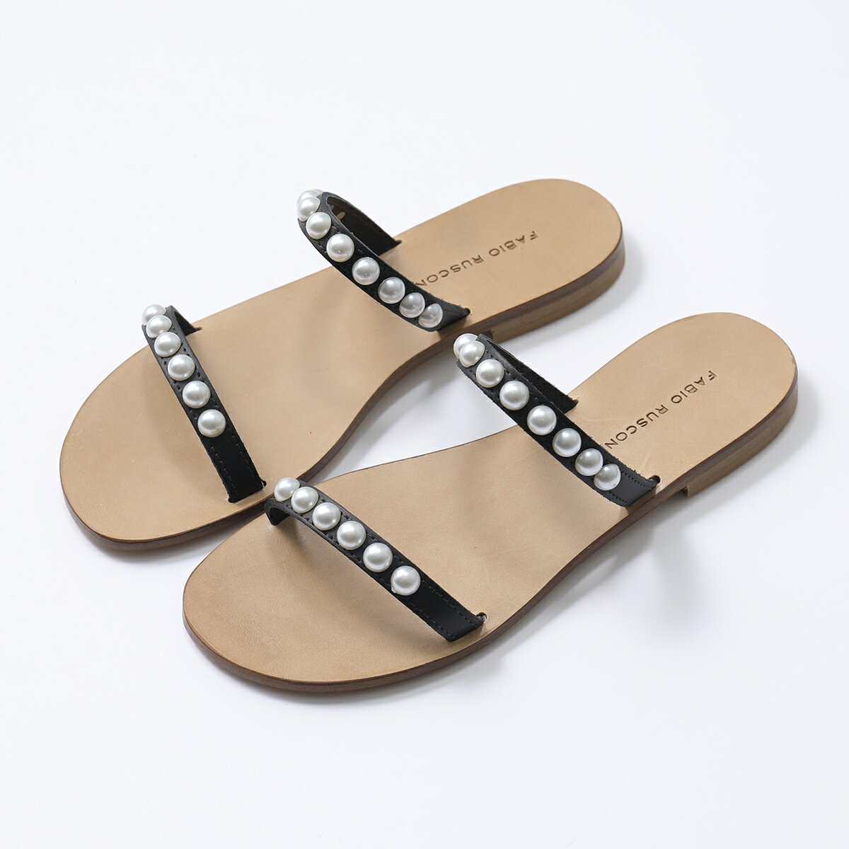 上質なレザーにパールが装飾されたダブルベルトサンダル。